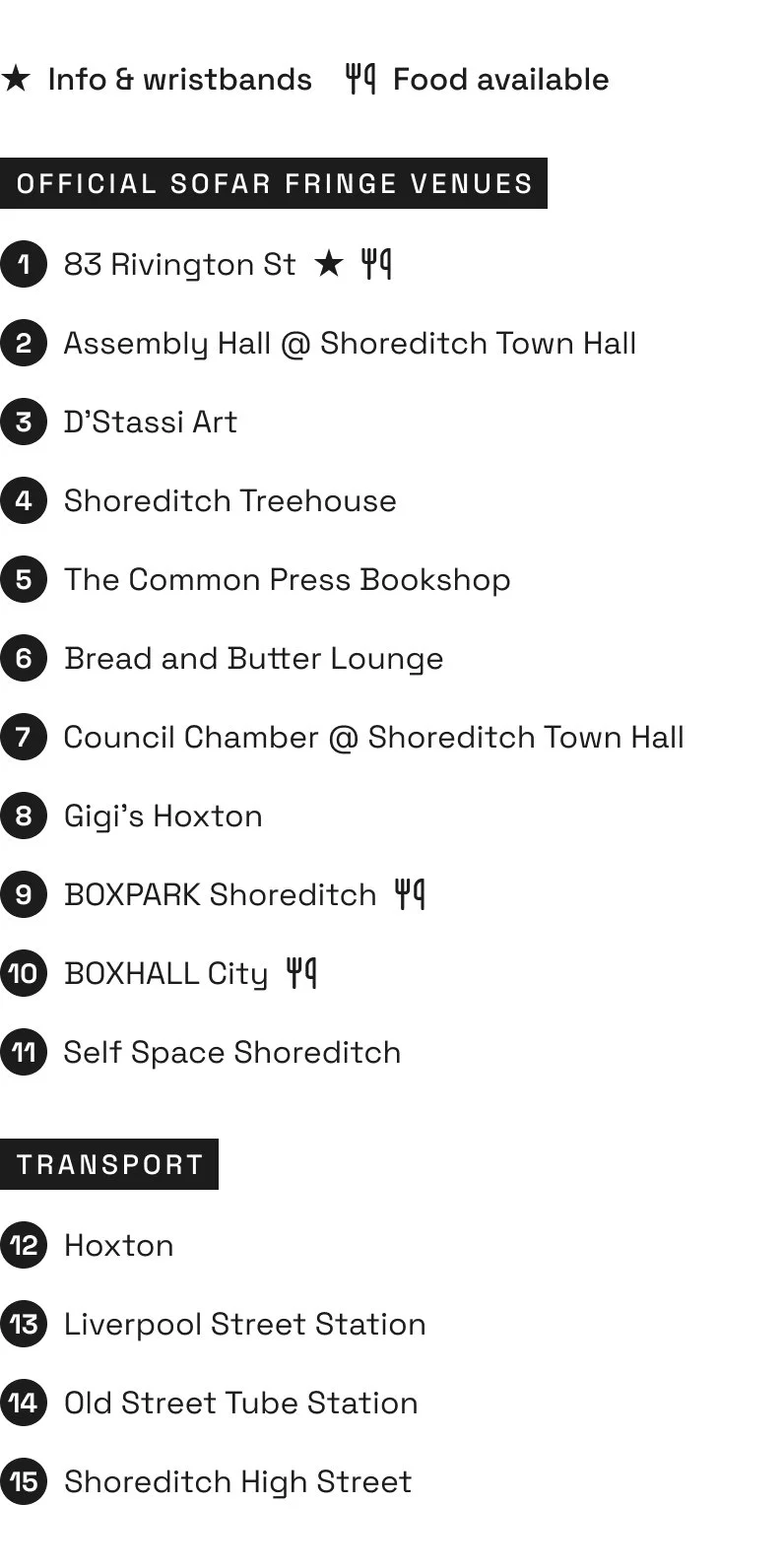Our venues are all in close walking distance to each other. There are a number of train, tube and overground stations that are close to the Sofar Fringe footprint.